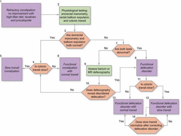 - Reprezintă abordarea de ultimă elecție și numai după testul de tranzit colonic efectuat în absența / apoi în prezența laxativelor, sau în cazul bolilor identificate care necesită abordare chirurgicală