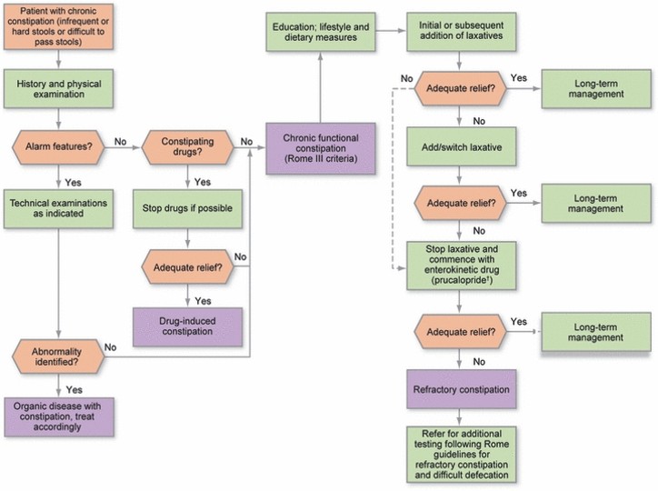 - Se începe prin evaluarea și excluderea patologiilor și cauzelor de constipație secundară.